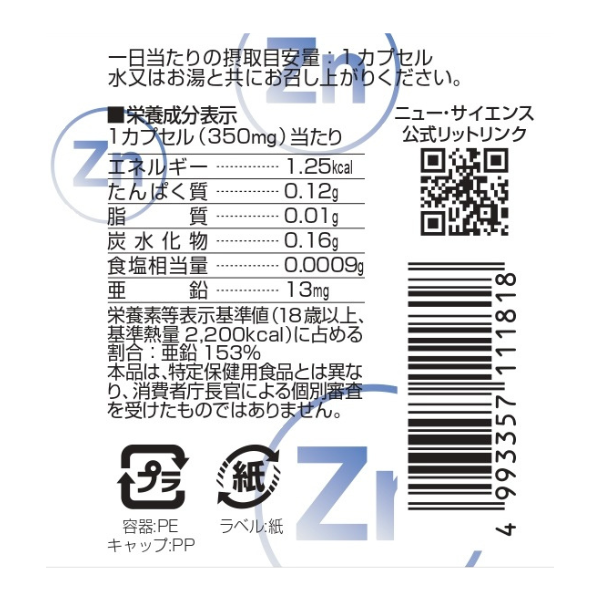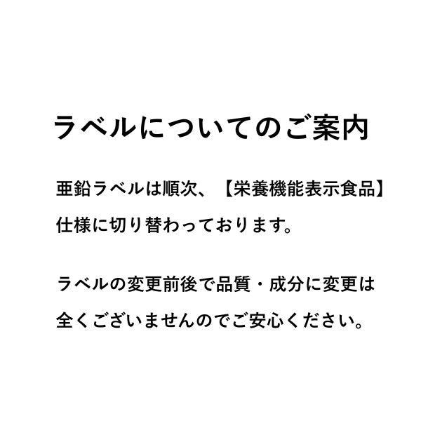 | 栄養表示 | 1カプセル(350mg)当たり: エネルギー 1.25kcal たんぱく質 0.12g 脂質 0.01g 炭水化物 0.16g 食塩相当量 0.0009g 亜鉛 13mg |