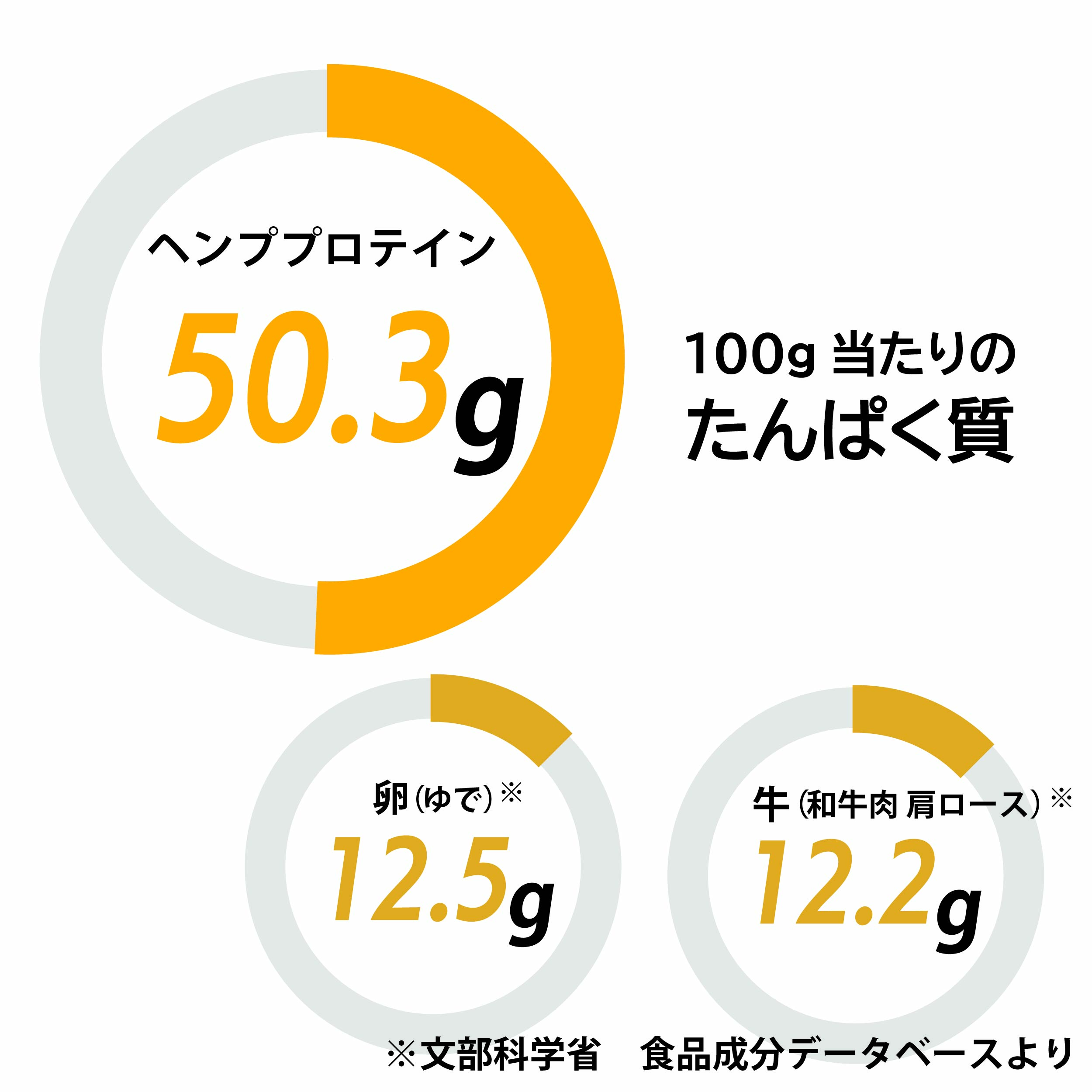 麻の実粉末にはたんぱく質が牛肉や卵・魚よりも多く含まれています。(100gあたり)