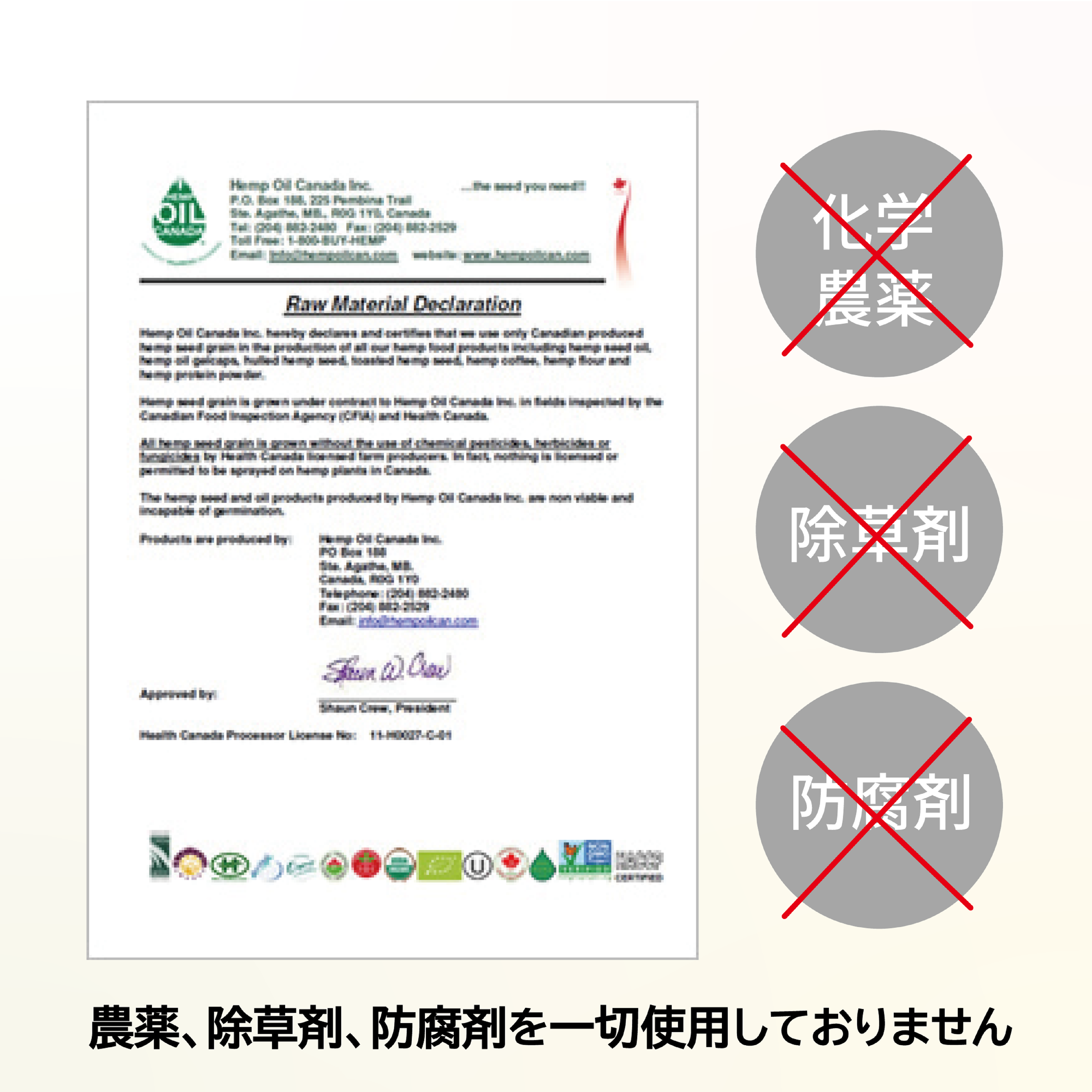 ヘンプオイルカナダ社は麻の実油、麻の実油カプセル、麻の実ナッツ、加熱麻の実、ヘンプコーヒー、麻の実粉及びヘンププロテインパウダーを含む自社製品すべてにおいてカナダ産の麻の実を使用していることをここに証明します。