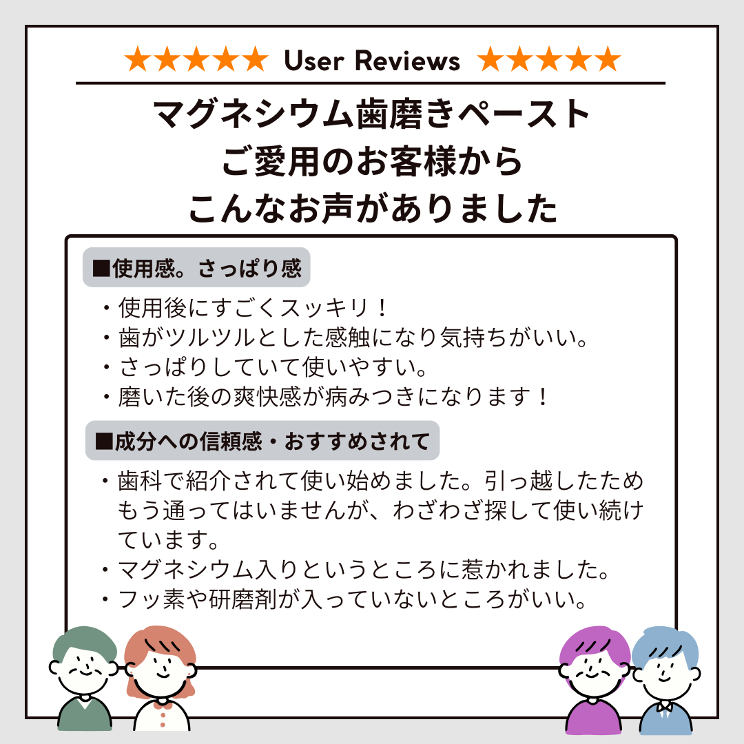 ・塩化マグネシウムを15%含有。歯磨きとしては他に類を見ないほどの高濃度です。日々行う歯磨きで口腔内粘膜からマグネシウムを補いましょう。