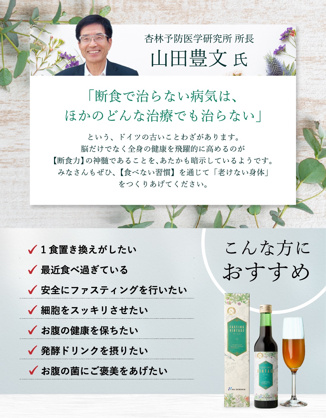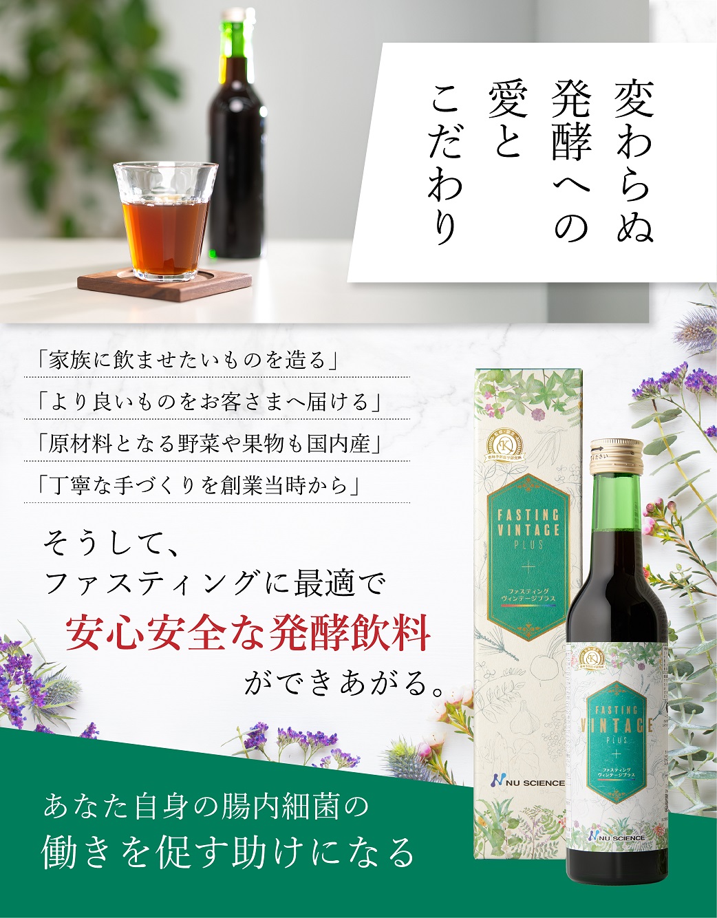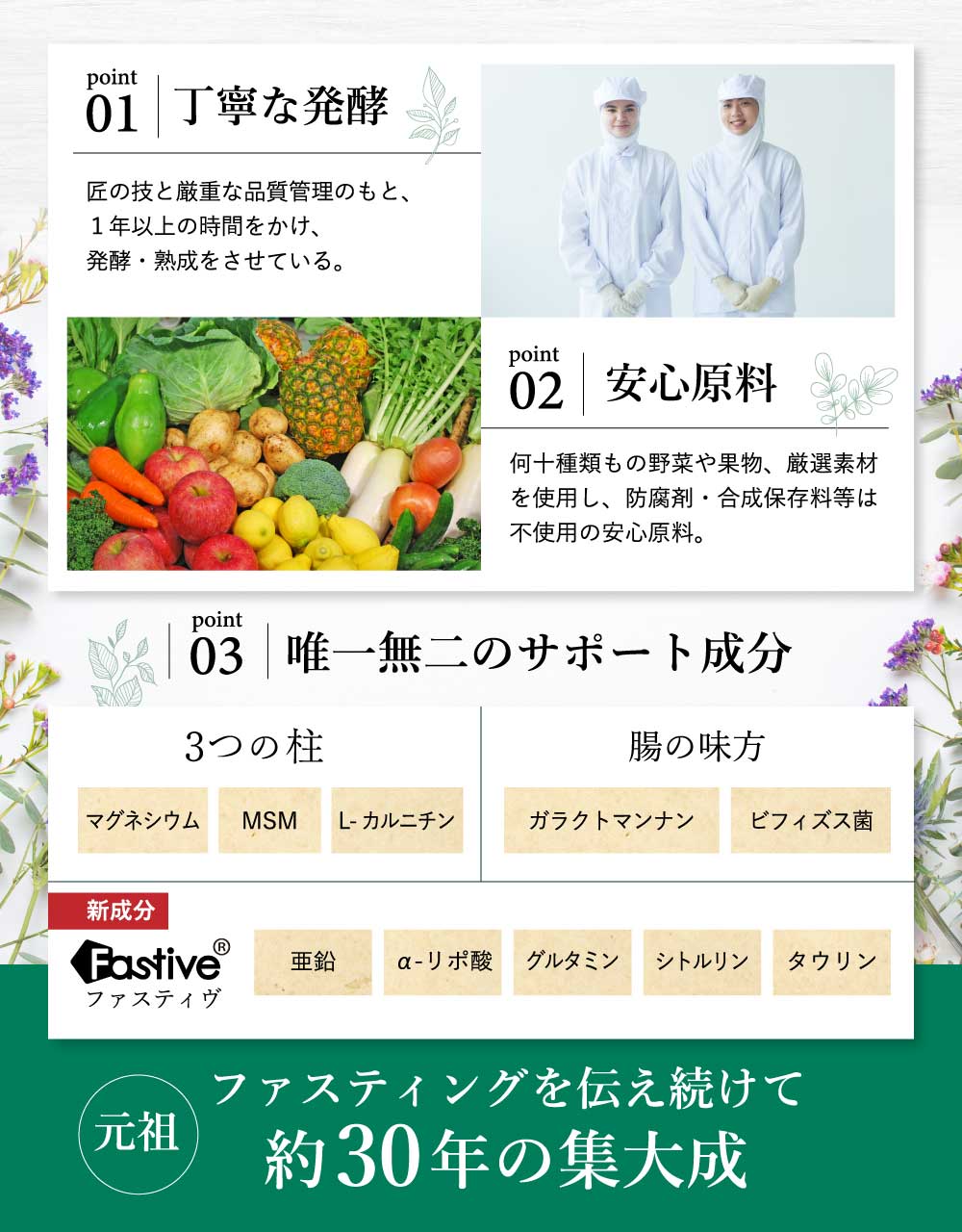 厳選された野菜・野草・果物を乳酸菌や酵母の力で自然発酵、自然熟成させ、 「山田式ミネラルファスティングⓇ」に欠かせないマグネシウム、L-カルニチン、MSM(硫黄)、厳選されたビフィズス菌を加え、さらに杏林予防医学研究所にて新開発された「ファスティヴ®」を配合し、最高のミネラルファスティングが体験できるドリンクになりました。 防腐剤、合成保存料等は一切使用していません。