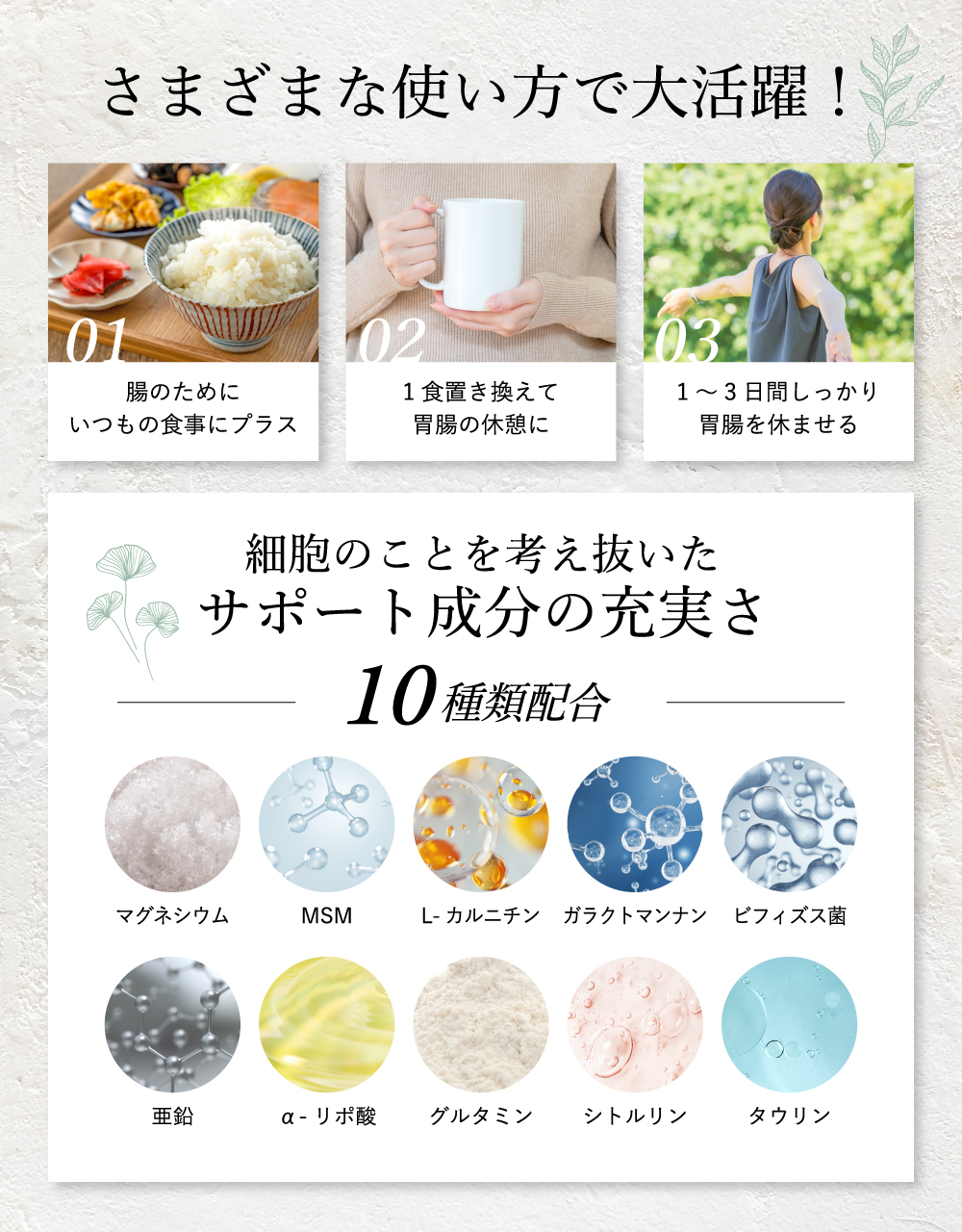 植物発酵エキス(国内製造(黒砂糖、キャベツ、イチゴ、リンゴ、ダイコン、トマト、ユズ、カキ(実)、キウイフルーツ、キュウリ、ナス、ホウレンソウ、小松菜、ピーマン、セロリ、ゴーヤ、シソ、ニンジン、プルーン、ヨモギ、大豆(分別生産流通管理済み)、オリゴ糖、ブドウ、ミカン、モモ(実)、カボチャ、レイシ、日本山人参(葉・茎)、大麦若葉、ケール、玄米、コンブ、スイートコーン、モロヘイヤ、キンカン、米ぬか、シイタケ、レモン、キクラゲ、ココア、根コンブ、ヒバマタ、ワカメ、ブルーベリー、アカメガシワ、アケビ(実)、オオバコ、クマザサ、ヤマモモ、スギナ、ビワの葉、ヒジキ、マイタケ、ナシ、チンゲンサイ、ウメ、ウコン、レンコン、イヨカン、ビタミン菜、イチジク、ゴボウ、ヤマブドウ、ブロッコリー、ショウガ、アスパラガス、カリン、パセリ、セリ、キイチゴ、ミツバ、ミョウガ、グミ、ブラックベリー、冬イチゴ))、ガラクトマンナン分解物、MSM、カルニチン、シトルリン、ビフィズス菌末(殺菌)、α-リポ酸、亜鉛含有酵母、生姜汁/グルタミン、塩化マグネシウム、タウリン(抽出物)、(一部にリンゴ・キウイフルーツ・大豆・モモを含む)