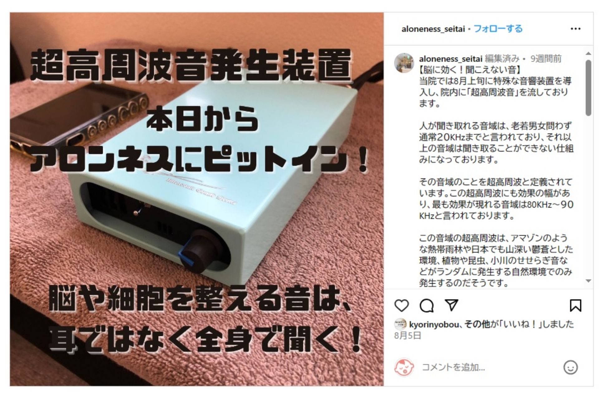 こちらの整体院では、弊社の音響機器「USD」と「ミニ・フロイデ・システム」をご導入いただき、施術室に設置しておられています。(https://alonenessbody.com/)